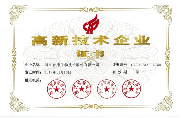 新年新喜訊!憑借專業(yè)的研發(fā)隊(duì)伍、雄厚的技術(shù)實(shí)力、持續(xù)的創(chuàng)新能力、科學(xué)的企業(yè)管理,普康公司被重新認(rèn)定為國家級(jí)高新技術(shù)企業(yè)。近日,公司收到了由浙江省科學(xué)技術(shù)廳、浙江省財(cái)政廳、浙江省國家稅務(wù)局、浙江省地方稅務(wù)局聯(lián)合頒發(fā)的“高新技術(shù)企業(yè)證書”。