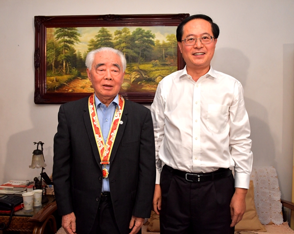 “新中國成立70周年大慶馬上就要到了。我代表省委、省政府來看望你,向你致以崇高的敬意!總書記、黨中央、國務(wù)院、中央軍委沒有忘記你們這些為革命建設(shè)改革事業(yè)作出突出貢獻(xiàn)的科研工作者。”在毛院士家中,車俊書記親切地向他表達(dá)慰問,獻(xiàn)上鮮花,并親自為他戴上紀(jì)念章。車俊書記對毛院士潛心研究甲肝疫苗,把科研成果轉(zhuǎn)化成產(chǎn)業(yè),大幅度減少甲肝病患、造福廣大群眾所作出的貢獻(xiàn)給予了高度評價。毛院士非常感謝黨和國家對他的培養(yǎng)、省委省政府一直以來的正確領(lǐng)導(dǎo)和全力支持。他深情回顧了甲肝疫苗的研發(fā)、成果轉(zhuǎn)化、產(chǎn)業(yè)化規(guī)?;a(chǎn)的艱辛歷程,追溯了習(xí)近平總書記2005年視察我公司所作出的指示精神,表示要繼續(xù)為健康事業(yè)發(fā)展作出自己的貢獻(xiàn)。