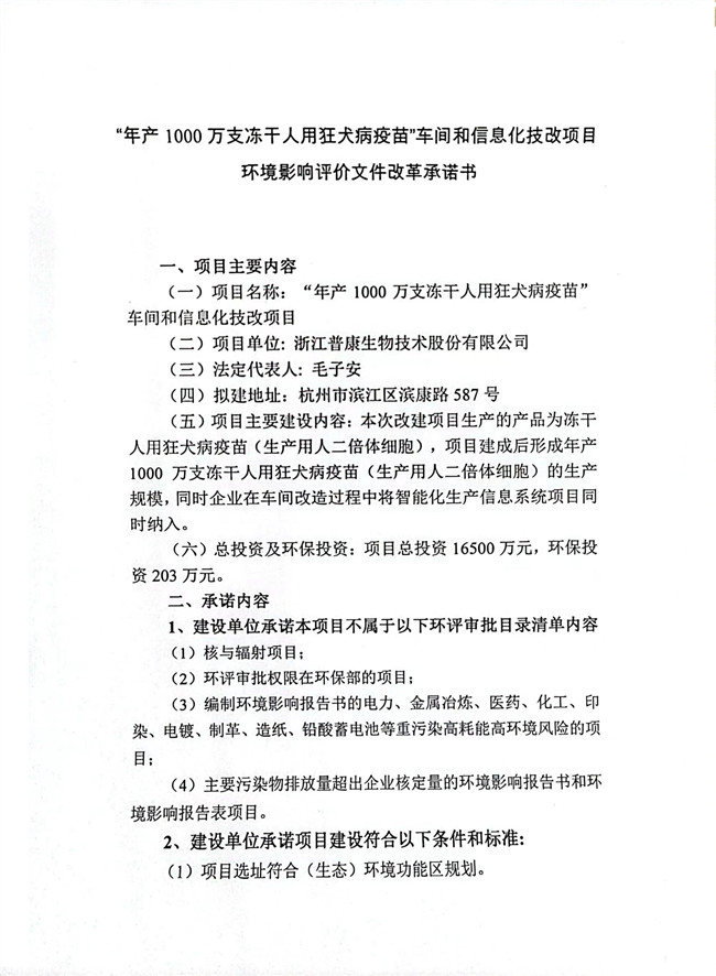 “年產(chǎn)1000萬支凍干人用狂犬病疫苗”車間和信息化技改項(xiàng)目--“規(guī)劃環(huán)評+環(huán)境標(biāo)準(zhǔn)”改革承諾書(詳見下圖)